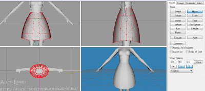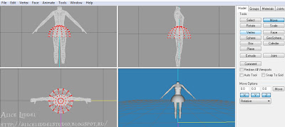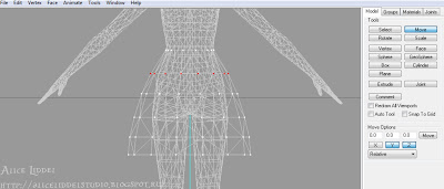 Можно заметить, что закрытый верх я удалила (хотя это необязательно) и подогнала инструментами Move и Scale под талию. Все ряды точек должны быть равноудалены друг от друга! Это обязательно, иначе кости могут не привязаться. Теперь стоило бы округлить низ, чтобы он не смотрелся сплошной линией. Выделяем нижний ряд точек и чуть-чуть смещаем вниз: