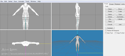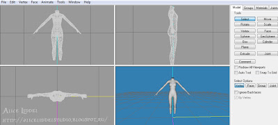 Для удобства замораживаем вертексы, чтобы случайно не деформировать меш. Для этого жмем на панели Select, полностью выделяем тело и жмем Ctrl+H(или заходим в Edit – Hide Selection). Наша моделька должна стать серой: