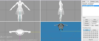 Открываем сохраненную после UVMapper модель меша в Милке. Если вы не хотите, чтобы изнанка платья была черной, выделяем группу с юбкой, дублируем (Edit - Duplicate Selection), затем применяем к продублированной юбке Face -Reverse Vertex Order (если изнанка все равно черная, то чуточку уменьшаем продублированную группу при помощи Scale).