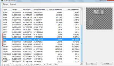 Все нужные операции проделаны, но остался последний штрих, ОБЯЗАТЕЛЬНЫЙ для всех креаторов, которые стремятся к качеству и не плюющие на тех, кто качает их контент. Уменьшаем вес платья, удаляя ненужные нам текстуры. В ворке жмем в верху панели Edit – Project Contents. В новом окне, выделенные мной DDS – это наши текстуры. Их должно быть 3-6. Текстуры, которые загружались ранее и оказались ненужными, тоже там сохраняются, проверьте файлы на их наличие. Другие расширения трогать нельзя, только DDS!
