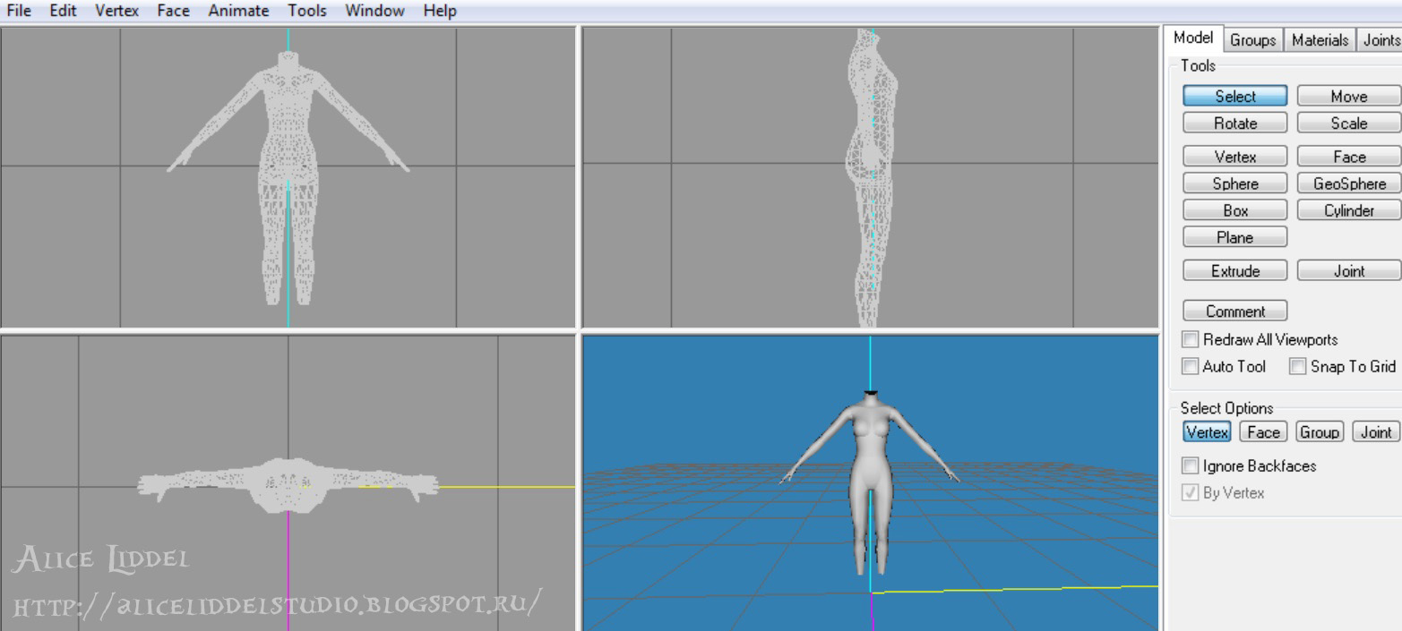 Скачать), ну и, само собой, любая 3d программа (я работаю в трех для собственного же удобства – Milkshape, Khed и 3d Max, но вам хватит и одной). Туториал пишется с использованием Milkshape (Милка – разг.). Поскольку я собираюсь сделать женскую одежду, а именно платье, то используем меш женского тела с названием afbody.obj (для справки: AF – сокращенное обозначение меша тела взрослой женщины (Adult Female) , AM – меша взрослого мужчины (Adult Male) , EF-EM – женские и мужские меши для пожилых, TF-TM – женские и мужские меши для подростков, СU – меш для детей (Child Unisex), PU – меш для тоддлеров (Puppy Unisex)).