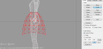 Я хочу чуть удлинить юбку и придать ей немного вытянутую форму. Выделяем каждый ряд вертексов и чуть опускаем его. Также можно экспериментировать с размером и пышностью юбки, используя Sсale и вбивая туда разные значения (если хочется немного уменьшить, то пишем 0.9, 0.9, 0.9. если же увеличить – 1.1, 1.1, 1.1).У меня получилась вот такая, эээ… симпатичная юбочка: